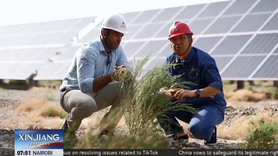 外籍主持人林肯探访了全球最大的“草光互补”光伏基地——阿合雅光伏产业园。这片由181万块光伏板组成的蓝色海洋,占地493公顷,相当于700个标准足球场。不仅能够提供满足约43万人全年用电需求,还兼具治沙功效。中国华能集团乌什光伏电站负责人周博表示,这类光伏设施能够稳固土壤、防止侵蚀,板面凝结的水珠还可灌溉下方土地,支持植物持续生长。“戈壁奇迹”的背后,是国家实现“双碳”目标而推动的生态与能源的“双向奔赴”。