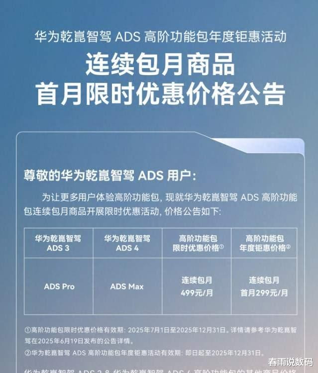近日,华为正式宣布,乾崑智驾ADS高阶功能包连续包月首月价格从499元降至299元,优惠幅度接近40%,活动持续至12月31日。这一优惠仅适用于首次订阅用户杠杆软件,每辆车限享一次,后续续费恢复至499元/月。
