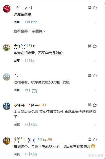 另一个原因是,部分消费者认为鸿蒙智行汽车本身已经存在相对高的溢价,并且这个溢价很大一部分因素是华为智驾带来的。现如今华为智驾功能额外收费,这加剧了他们的不满。这些消费者认为,华为通过强大的品牌影响力和营销能力,让消费者愿意为性价比较低的鸿蒙智行汽车支付更高价格。他们认为,华为智驾收费相当于“吃完车企,又吃用户”,让消费者承担了双重成本。
