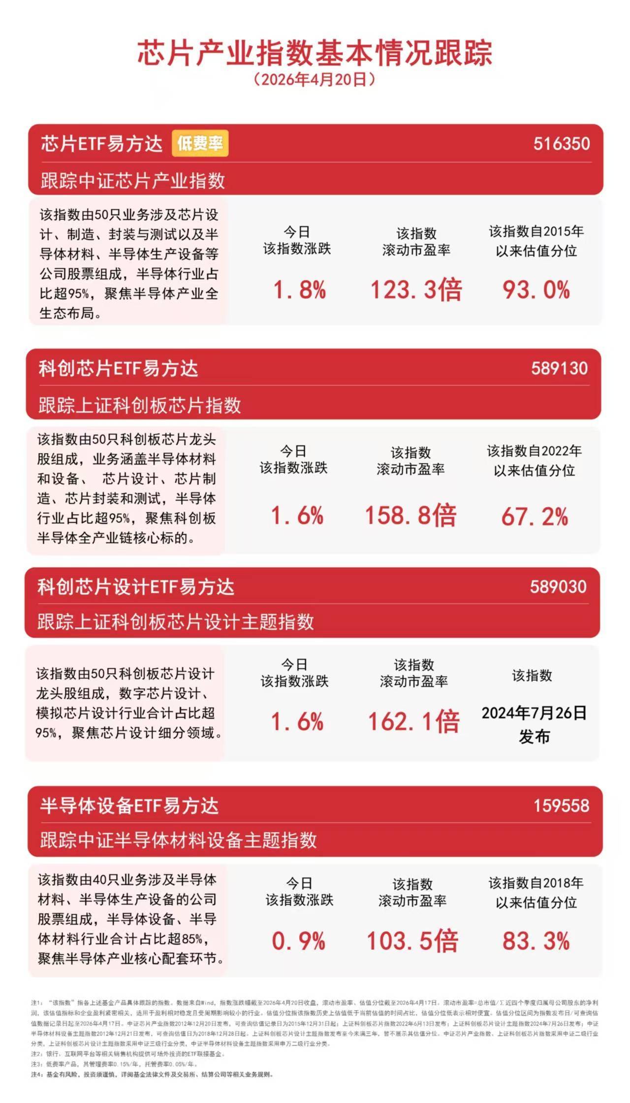 4月20日,半导体产业链持续走高,液冷、半导体材料等涨幅居前,截至收盘,中证芯片产业指数上涨1.8%,上证科创板芯片指数、上证科创板芯片设计主题指数均上涨1.6%,中证半导体材料设备主题指数上涨0.9%,半导体设备ETF易方达(159558配资炒股平台,联接基金A/C:021893/021894)今日净申购超7000万份。